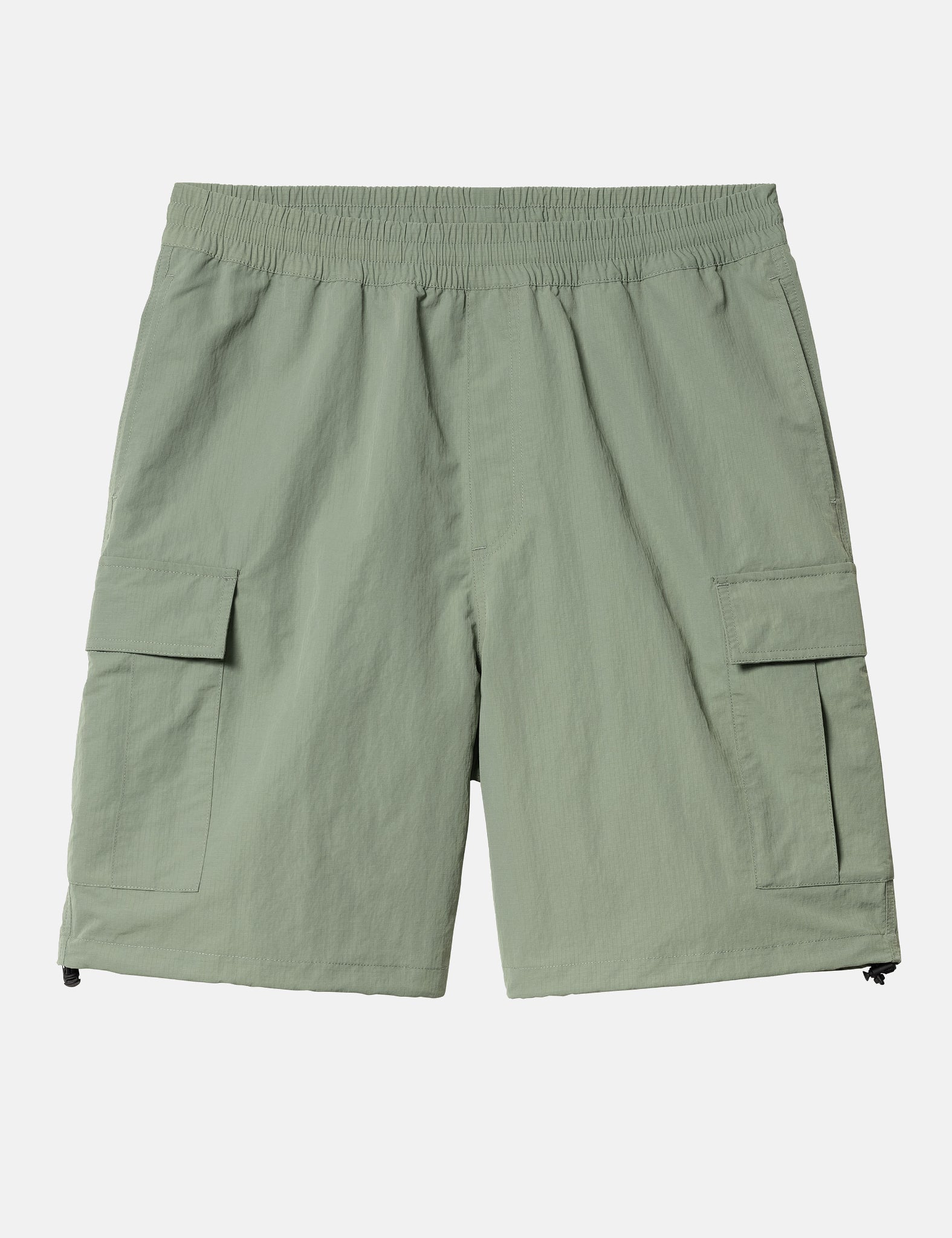 The Evers cargo short is made from lightweight nylon ripstop with a relaxed fit, featuring an elastic waistband and adjustable leg openings for a customisable fit. It also includes two side pockets, two flap patch pockets on the legs, and an extra back pocket with a zipper. The design is finished off with a woven military label.