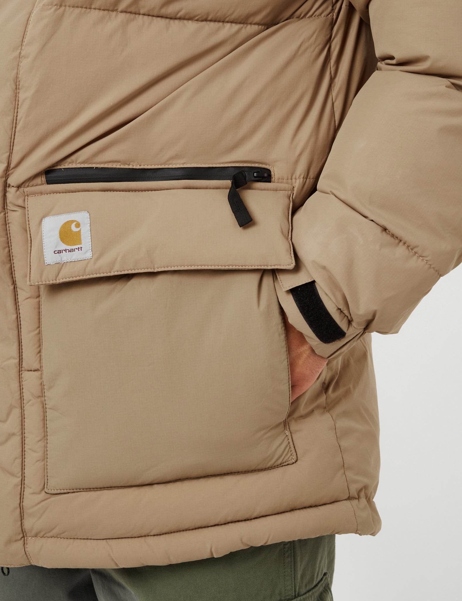 This piece is filled with artificial down for warmth, and features an adjustable hem and cuffs, with removable padded hood, three front pockets and a woven Square Label.