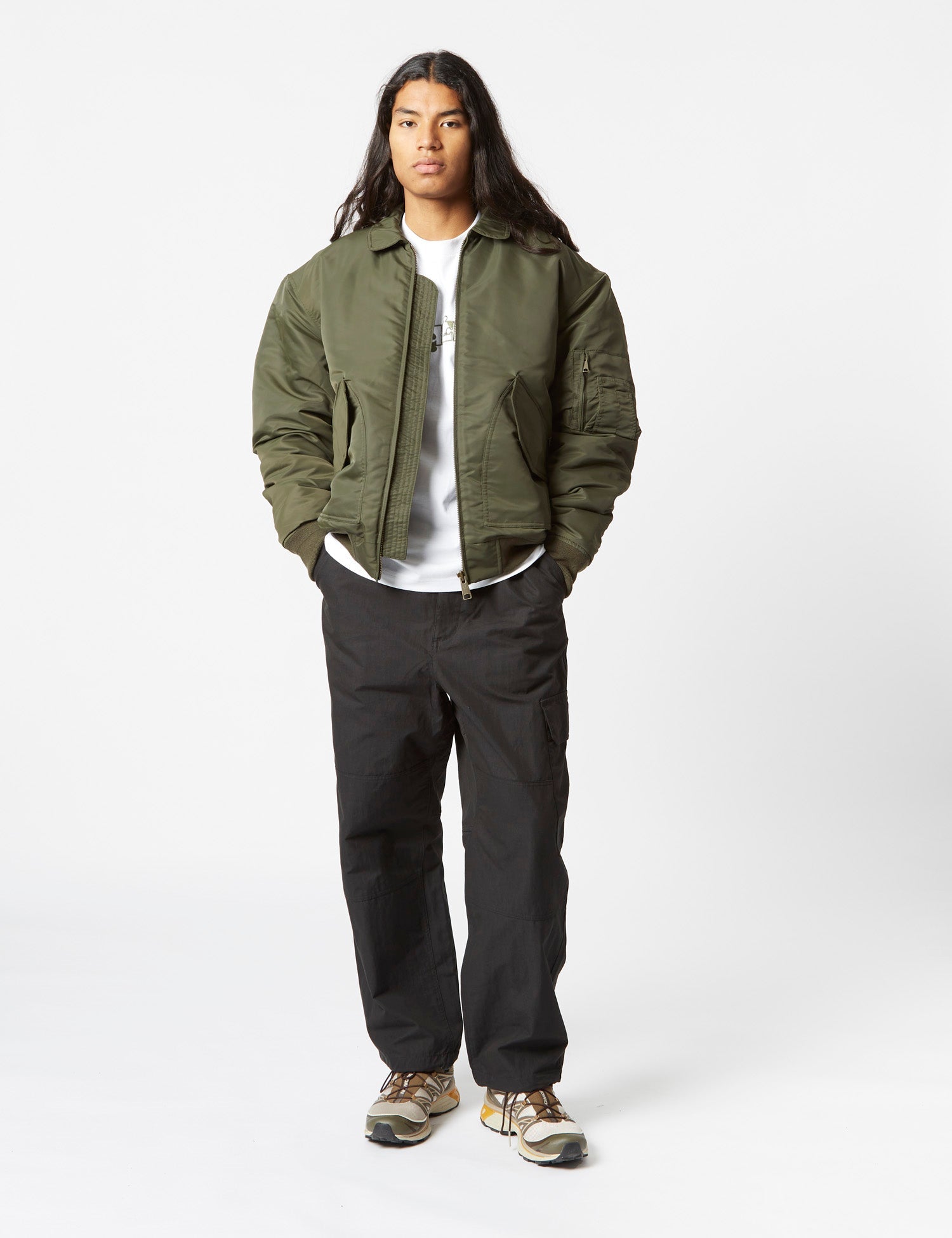 The silhouette of this jacket is military-inspired, giving you a touch of "I'm ready for action" vibes. It's like the classic MA-2 bomber, but with extra oomph. And let's not forget the rib-knit bottom band and cuffs ¨C they give the jacket a cinching effect, all while providing extra insulation. So not only do you look cool, but you're also super cozy.