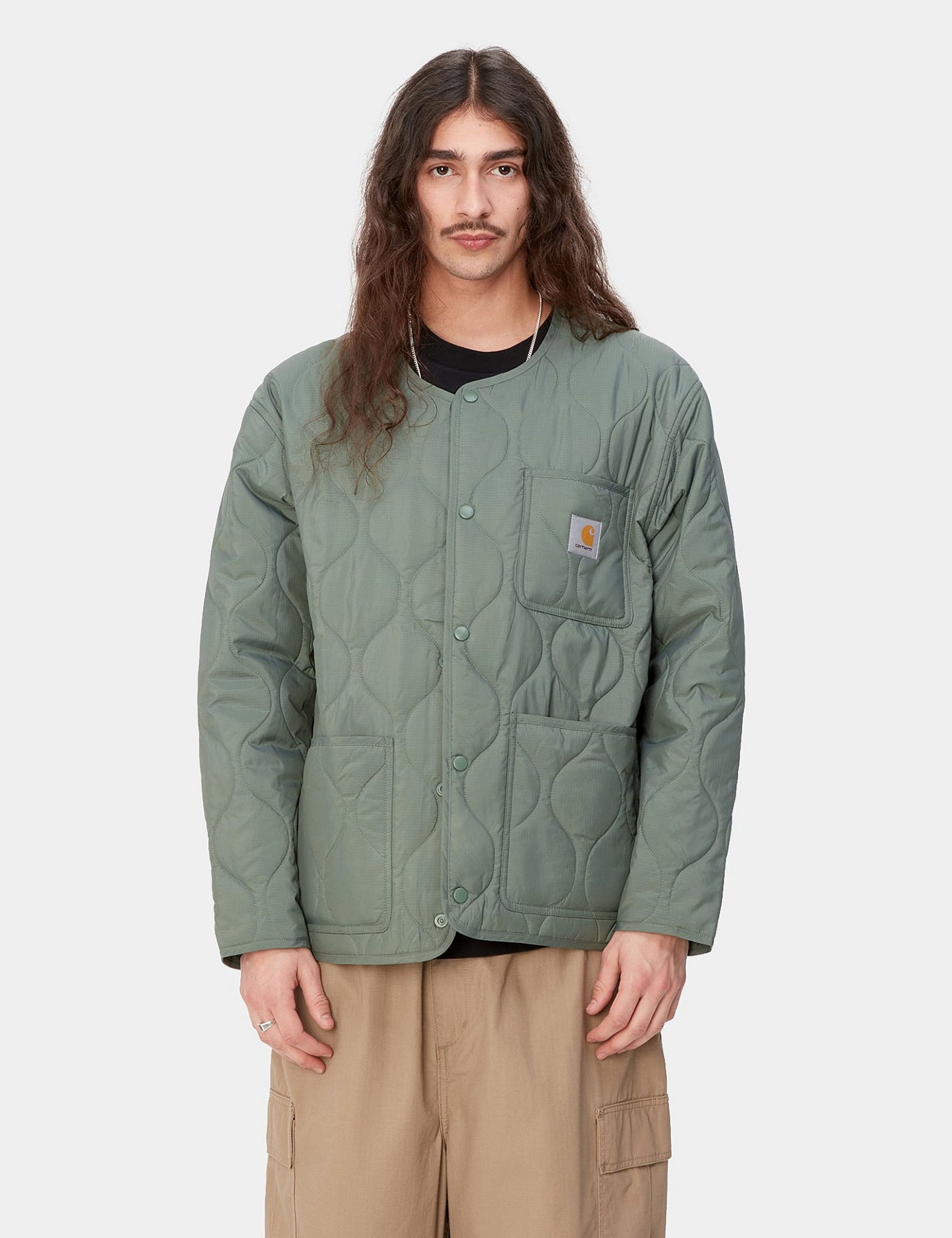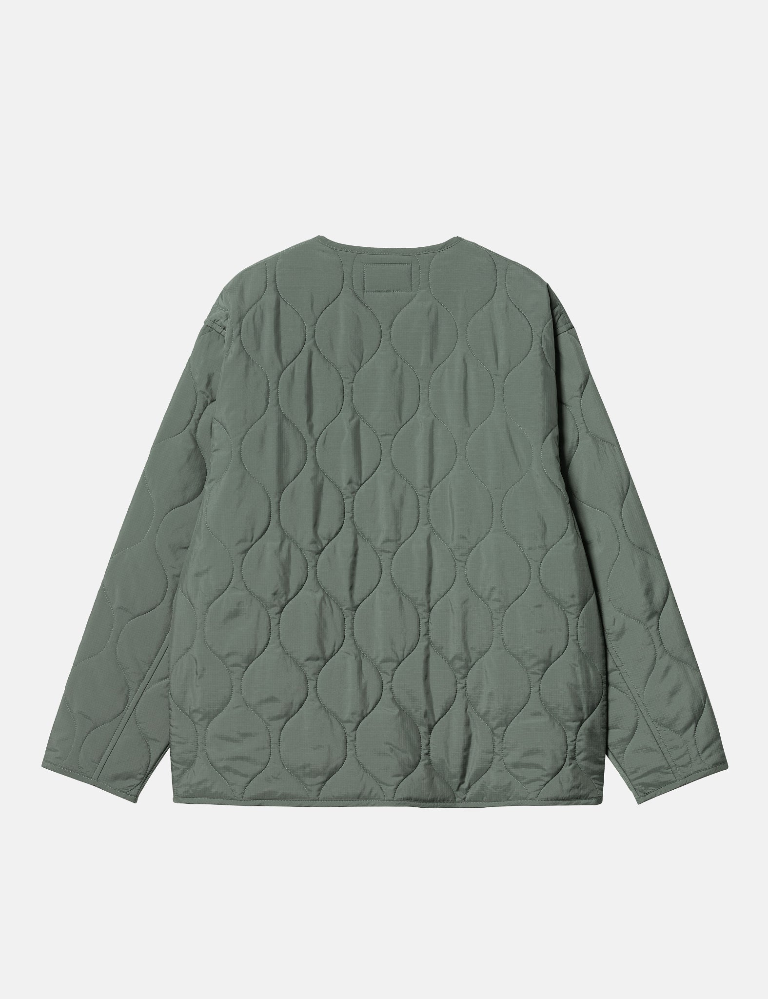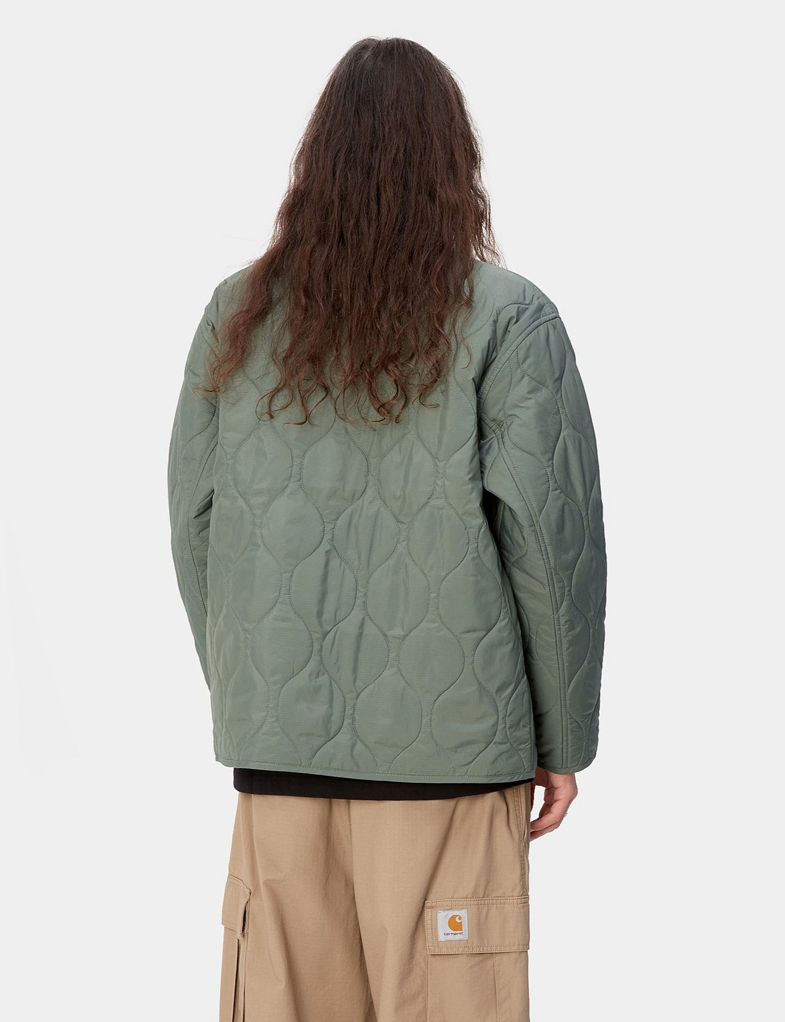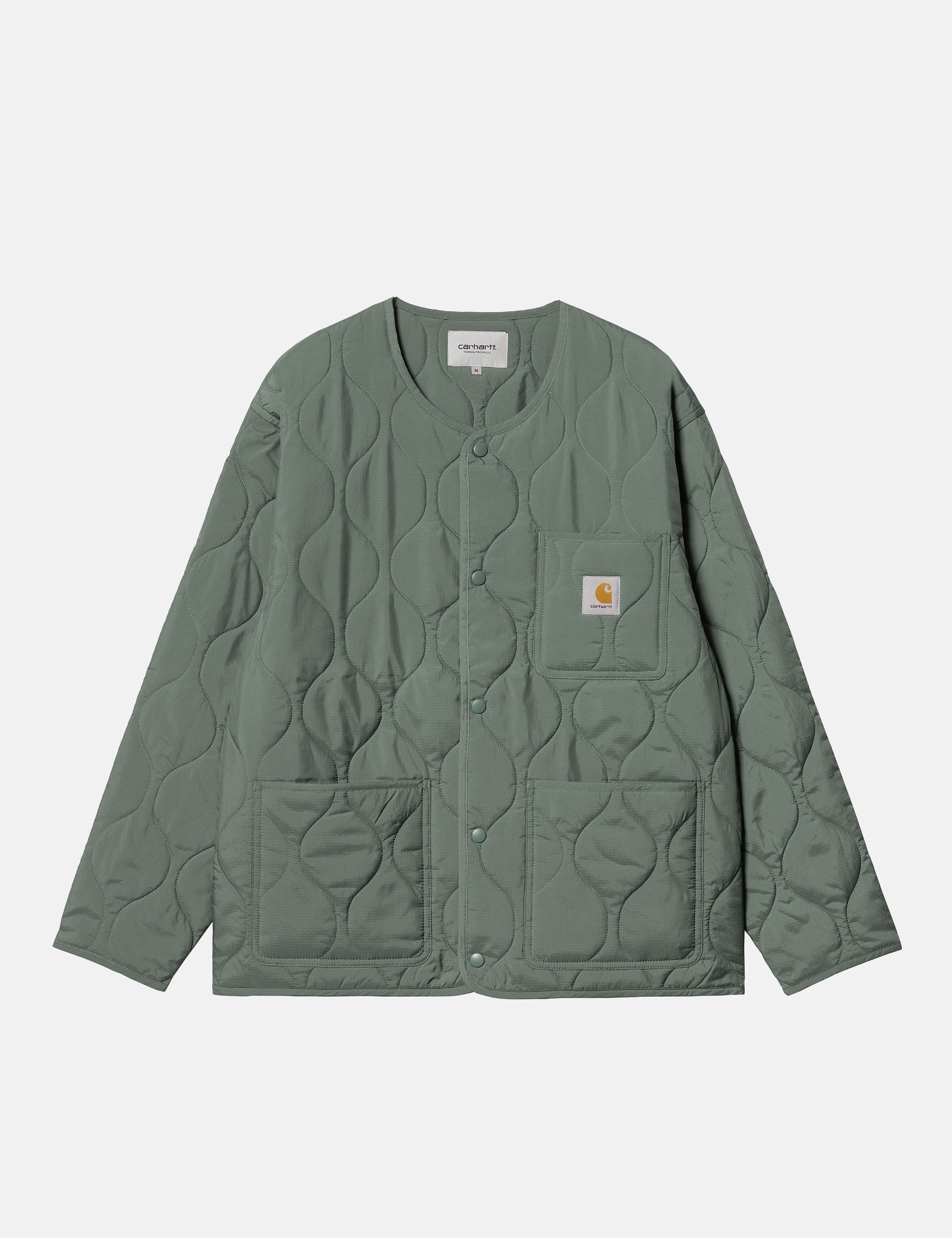 This park green Skyton Liner is crafted from recycled polyester ripstop and boasts an onion-quilted lining. The unique design includes a charming collarless neckline and snap-buttoned closure, as well as three functional front pockets. Finishing off the look is the distinct woven Square Label.